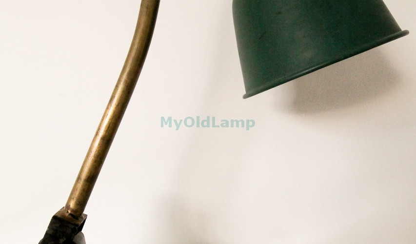 Mon commentaire : Modèle très intéressant que je qualifie d'hybride parce qu'il reprend les codes de la lampe de bureau banquier ou notaire avec son pied à étages et son bras courbé d'une part, mais d'autre part son réflecteur est typique des lampes d'atelier de l'époque. D'ailleurs, la polyvalence était voulue à la conception puisqu'une encoche sous le pied permet de placer la lampe en applique sur un mur. Cela lui donne une allure assez unique. Un mélange des genres plutôt réussi. Tout semble d'origine. Interrupteur poussoir sur le socle. Très long câble secteur transparent. Excellent état de conservation.
